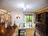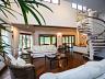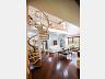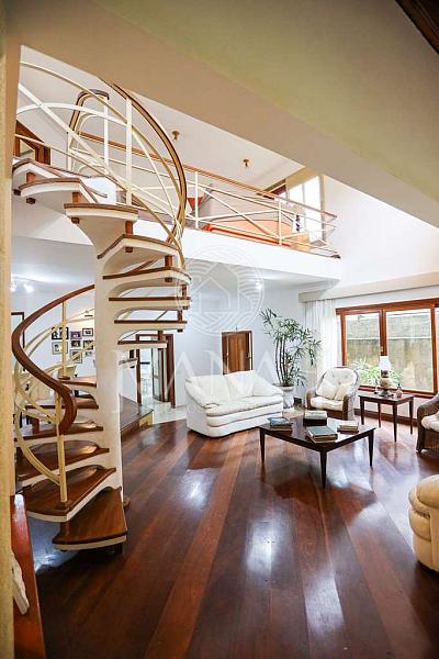 • Escada caracol levando ao mezanino — ideal como biblioteca ou espaço de leitura.